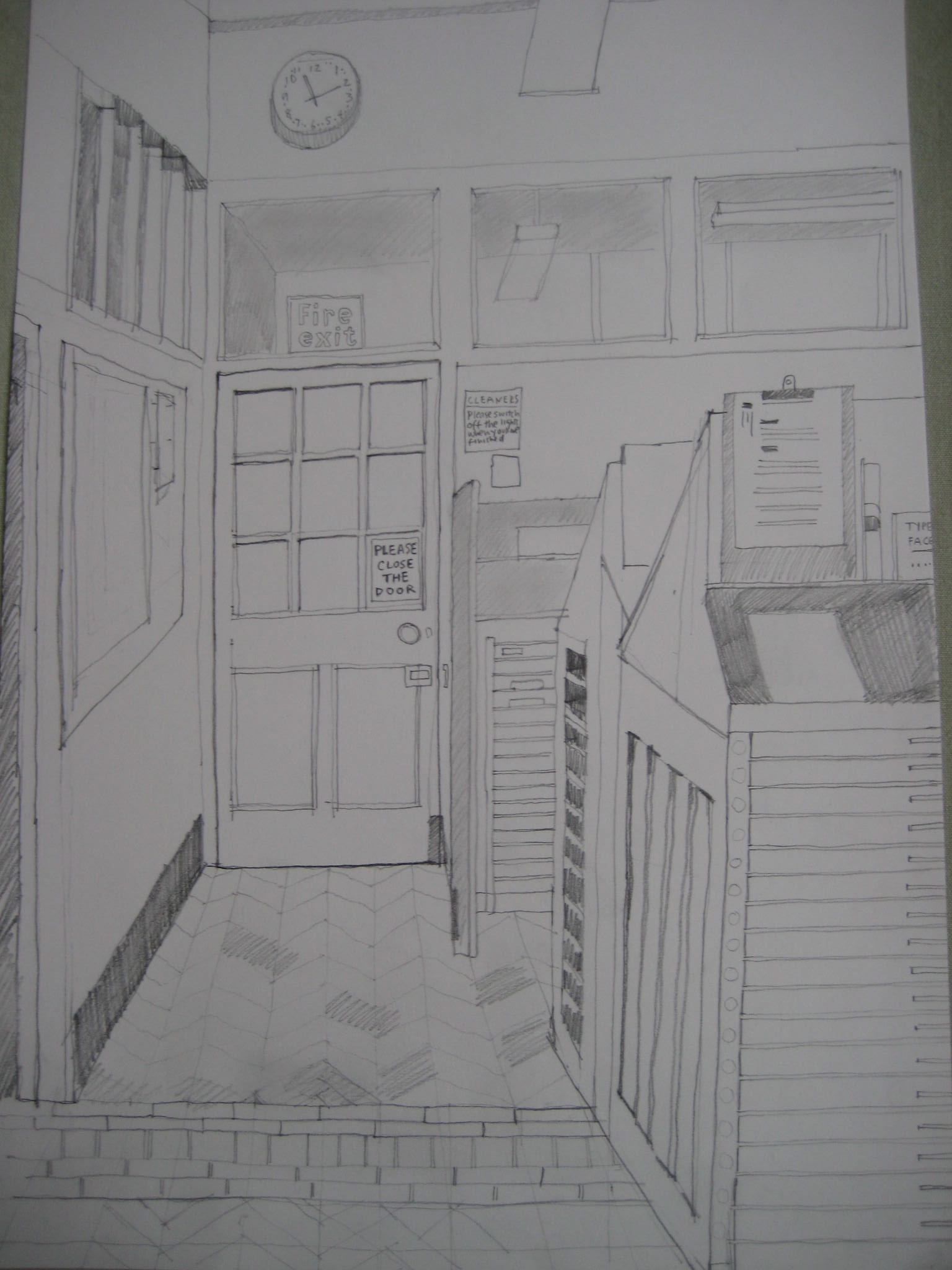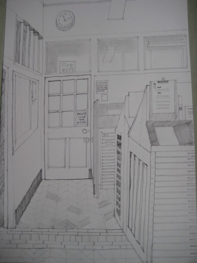 This drawing records the Type Setting Room at Central Saint Martins (CSM), Southampton Row, London. This time of year student shows are going on in Art Schools – so this is a small piece of history as the Central School is now CSM and is housed in a fab new building to the north of Kings Cross.